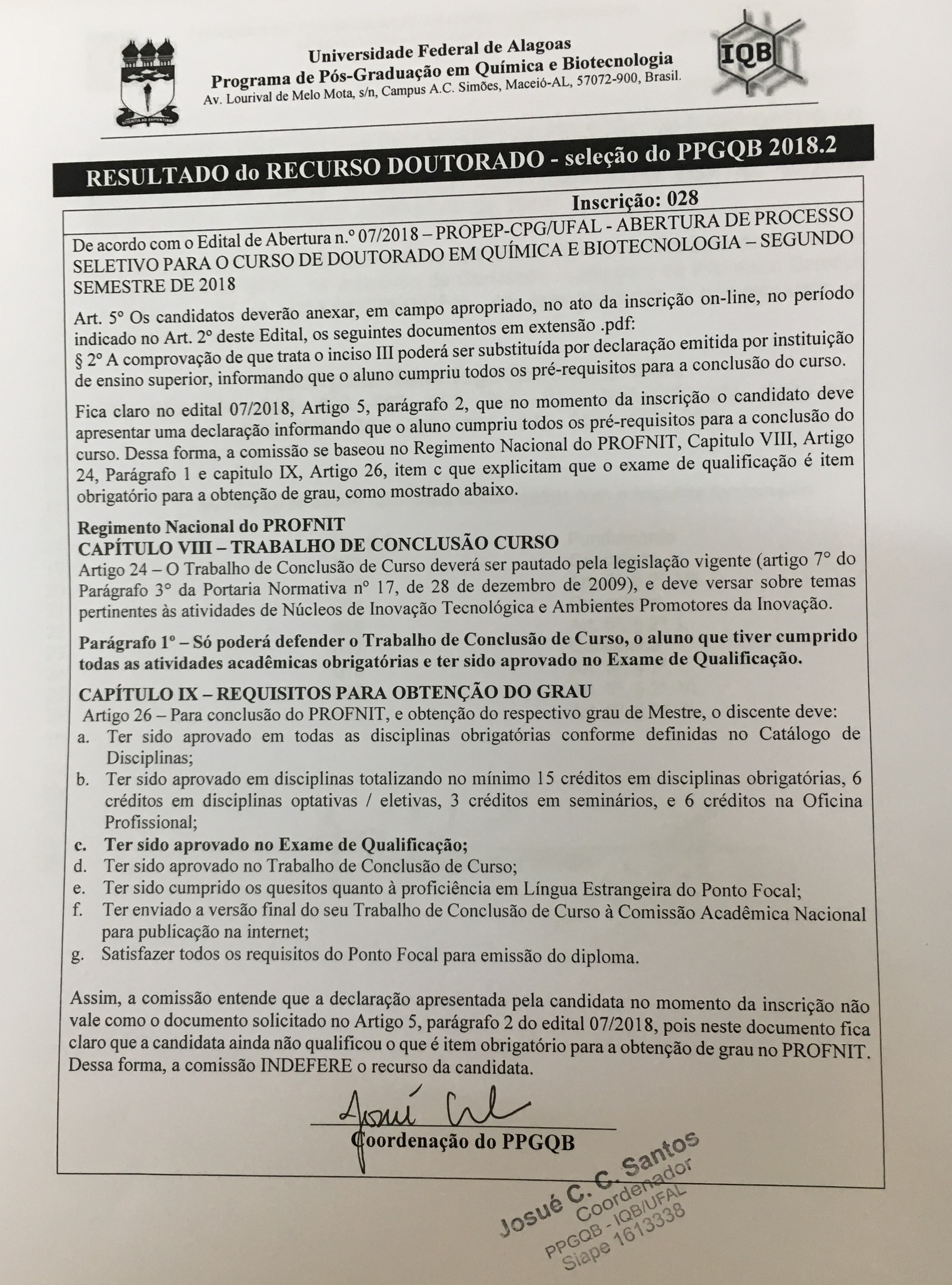 ANALISE DE RECURSO PARA A INSCRIÇÃO Nº. 28 DO DOUTORADO (NÃO HOMOLOGADA)