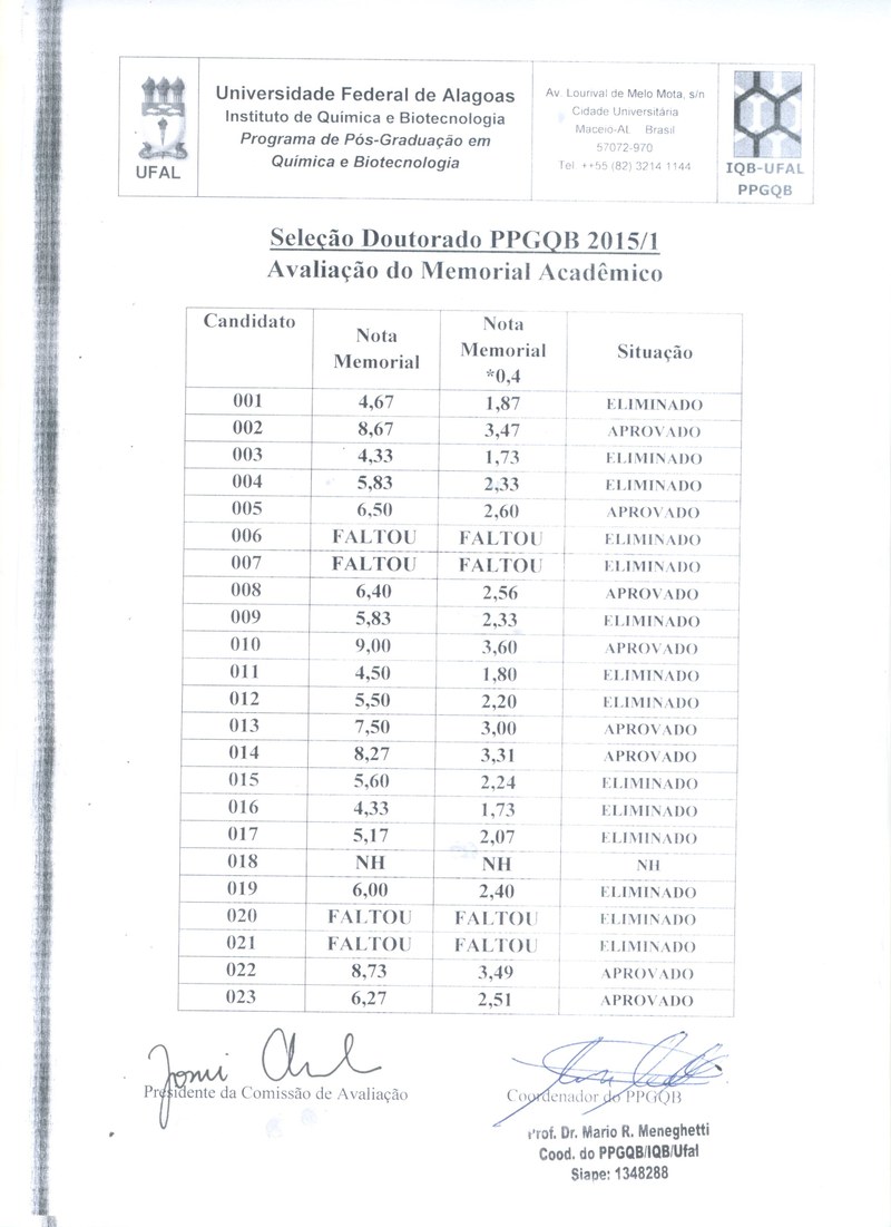 Resultado da Avaliação do Memorial Acadêmico - Doutorado PPGQB - 2015.1