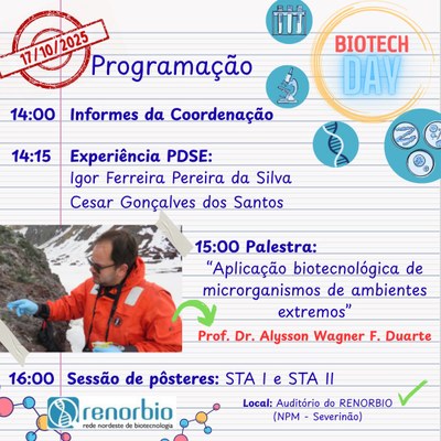 O Biotech Day 2025 contará com palestra especial proferida pelo Prof. Dr. Alysson Wagner Fernandes Duarte, com o tema "Aplicação biotecnológica de microrganismos de ambientes extremos". O Prof. Alysson Duarte é docente da UFAL - Campus Arapiraca e faz parte do quadro permanente do PPG-RENORBIO, já participou de três Expedições Brasileiras de Pesquisa na Antártica e atua na área de microbiologia. Além disso, o Biotech Day vai contar com o depoimento de dois participantes do Programa de Doutorado Sanduíche da CAPES, que falarão um pouco da sua experiência de estudo e pesquisa no exterior: Igor Ferreira Pereira da Silva e Cesar Gonçalves dos Santos.